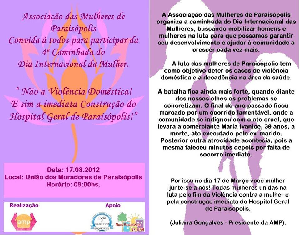 A Associação das Mulheres de Paraisópolis realizará no dia 17 de Março de 2012 a 4ª Caminhada em comemoração ao Dia Internacional da Mulher. Desde 2009 a Associação realiza o evento em prol das principais bandeiras que possam garantir qualidade de vida para homens e mulheres da nossa comunidade.