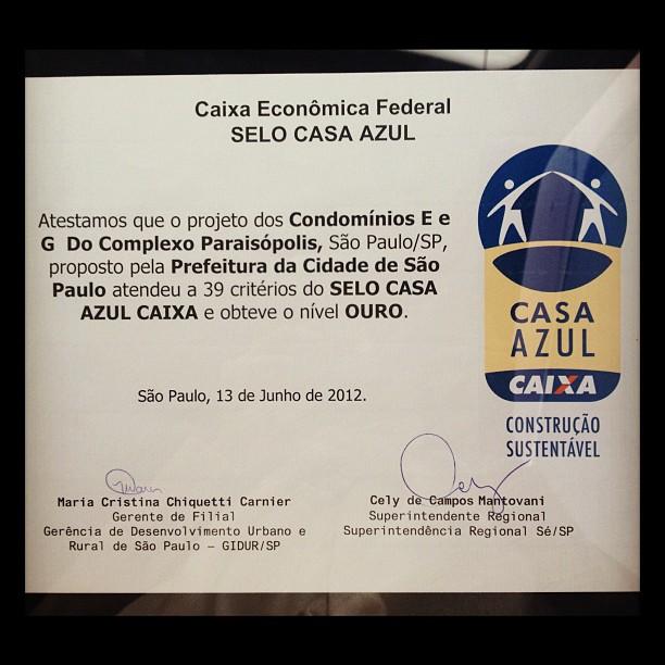 A Caixa Econômica Federal concedeu, nesta quarta-feira (13), o Selo Casa Azul – Nível Ouro ao projeto dos Condomínios E e G do Complexo Paraisópolis (SP), integrantes do Programa de Aceleração do Crescimento (Urbanização de Favelas). O projeto, apresentado pela prefeitura de São Paulo, possui 171 unidades habitacionais divididas em sete blocos de edifícios e encontra-se, atualmente, em obras.
