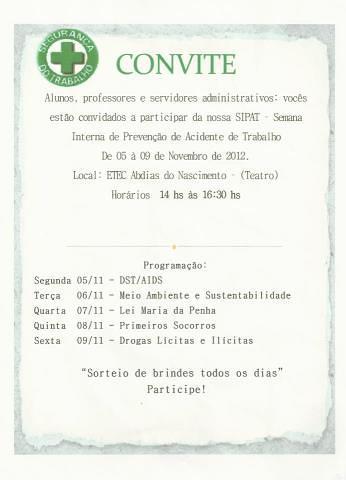 De 05 a 09 de Novembro das 14h as 16h30 Semana Interna de Prevenção de Acidentes do Trabalho na ETEC Paraisópolis