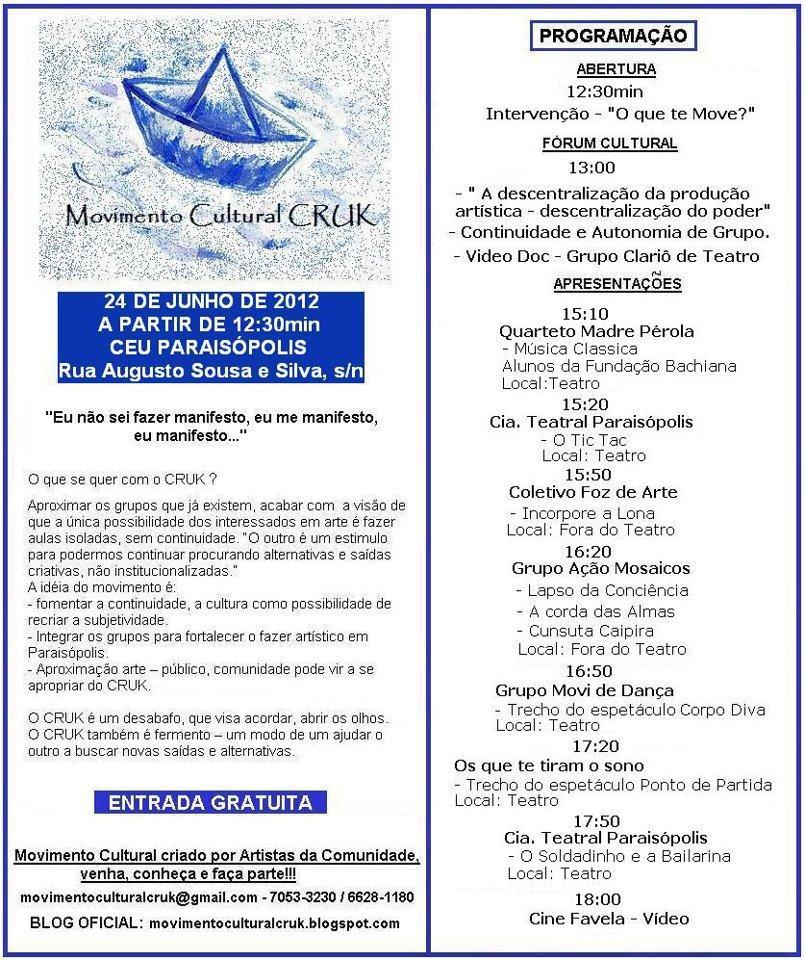 Movimento Cultural CRUK no CEU Paraisópolis neste domingo 24/06