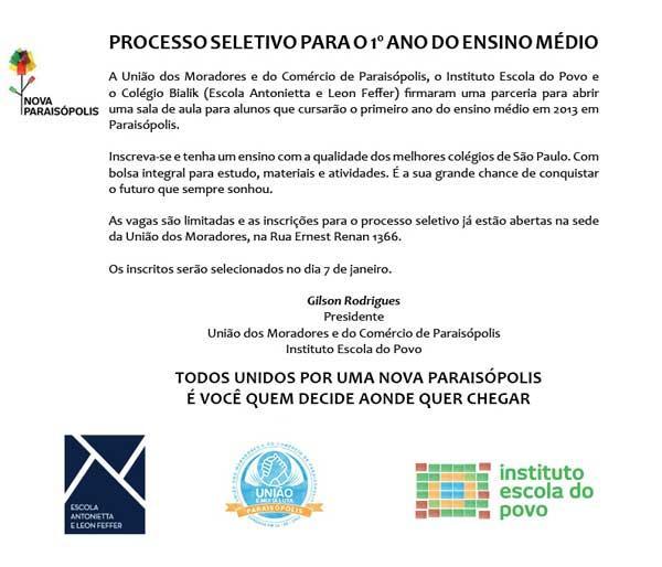 Vagas para o 1º ano do Ensino Médio em Paraisópolis